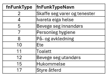 Skrøpelege eldre er definert som personar 75 år og eldre som har minst ei IPLOS-måling [2] i kommunale helse- og omsorgstenester med ein funksjonsverdi mellom 3 og 5 på minst eitt av dei ti områda nemnt i tabellen nedanfor. I samsvar med Helsedirektoratets definisjon er funksjonsverdiane summert i fire distinkte scoregrupper: